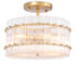 A modern take on classic style, this round semi-flush ceiling lamp with antique brass finish and clear glass crown is adorned with plates of ribbed clear glass for atmospheric lighting.