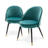Each chair is characterised by a seating and backrest in a Roche turquoise velvet upholstery with dark green piping, tapered black legs and brass caps. Team up different chairs from this series for an opulent style!