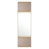 The sleek frame has a brushed brass finish and is divided in three parts. The upper and lower part contain smoked mirror glass, while the central part holds a mirror. Fringe-like accents overlap each piece, adding a sense of drama.