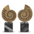 Ammonites were prehistoric marine animals with a coiled shell. They became extinct at the end of the Cretaceous period, about 66 million years ago, at roughly the same time as the dinosaurs disappeared. The objects are each mounted on a grey marble base.