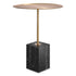 The round brushed brass table top is embellished with raised edges. It sits on a sleek stem which firmly rests on a block of black marble with white veins, giving it a chic and elegant look.