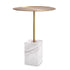 The round brushed brass table top is embellished with raised edges. It sits on a sleek stem which firmly rests on a block of white marble with grey veins, giving it a chic and elegant look.