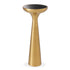 This stunning round end table features a brushed brass finish base and a black glass tabletop.
