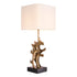 Made of casted brass and provided with a vintage brass finish, this extraordinary table lamp will add artistic flair to your décor. It features a sculptural body with organic appeal that sits on a black granite base and comes with a rounded square bouclé shade.