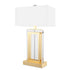 The modern lamp base has a clear crystal glass frame with gold finish and comes with a white right-angled lampshade.