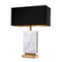 Comprised of white marble and antique brass finish details, it includes a black shade with gold coloured lining for a lovely warm glow when lit.