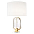 This lovely clear crystal glass lighting fixture is inspired by the emerald cut of precious diamonds. It is mounted on a triangular base with gold finish and comes with a round white fabric lampshade.