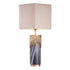 Shaped like a decagonal prism, its grey marble body is embellished with a rim of dripping metal in a vintage brass finish. The stunning design is topped off with a hexagonal linen mix shade.