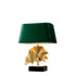 With its elegant curves and intricate detailing, this beautiful table lamp will grant tropical opulence to your interior. The lamp base features 3 polished brass palm leaves on a black granite base plinth. It comes with a green velvet lampshade.