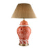 The lovely Palmarito Table Lamp sits on a circular antique brass plinth and the Chinese red porcelain base features the classic Ming vase shape with a floral design.