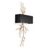 Two twig-shaped limbs appear from behind a black fabric rectangular lampshade. They are skilfully crafted from iron and provided with an antique brass finish.